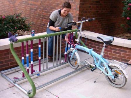 Thank you to all of our members and friends who came through to make this an amazing event! We gathered up overflowing bags of knitting projects to contribute to the Grafly Sculpture Garden and throughout the campus. Marnette’s cute birdie landed on the bike rack in front of the Ulrich Museum.