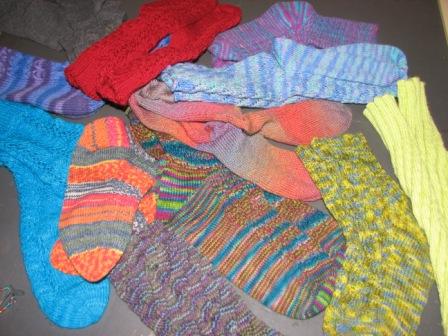Almost 20 members and friends participated in the first Secret Sock Exchange! About 4 months ago, we learned how to make a foot form (basically a foot manequin out of duct tape) and tossed all of our feet into a pile). Everyone selected a foot and knit a pair of socks to fit their Secret Sock buddy. At the August & September Guild meetings, we exchanged our socks and found out who our knitting buddy was! This was so much fun. All participants received a custom sock stitch marker as a thank you from the Guild. *If you didn’t get your stitch marker, please let us know!
