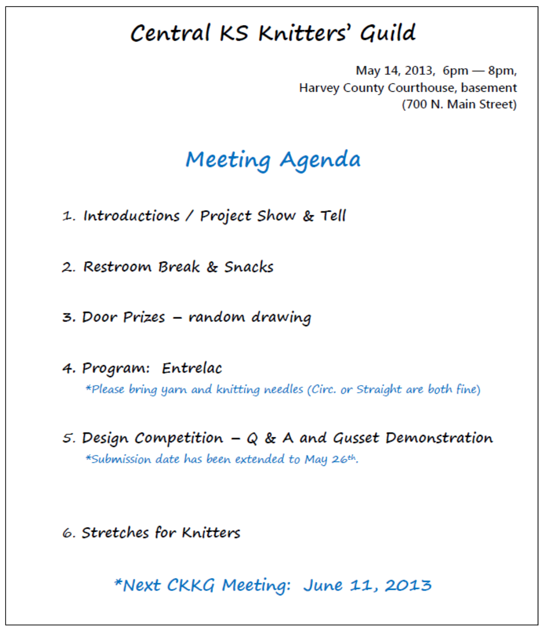 Grab your knitting and a friend and join us for the April Knitting Guild meeting! Tuesday, May 14th from 6-8pm at the Harvey County Courthouse (Newton, Main & 7th streets). *Check our Ravelry page for more information and carpool details.